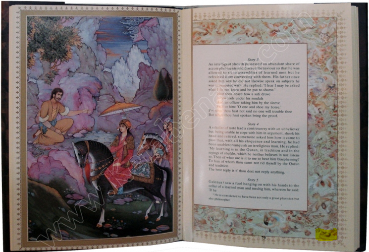 توانگر زادهای را دیدم بر سر گور پدر نشسته و با درویش بچهای مناظره در پیوسته که صندوق تربت ما سنگین است و کتابه رنگین و فرش رخام انداخته و خشت پیروزه درو به کار برده به گور پدرت چه ماند خشتی دو فراهم آورده و مشتی دو خاک بر آن پاشیده. درویش پسر این بشنید و گفت تا پدرت زیر آن سنگهای گران بر خود بجنبیده باشد پدر من به بهشت رسیده باشد.